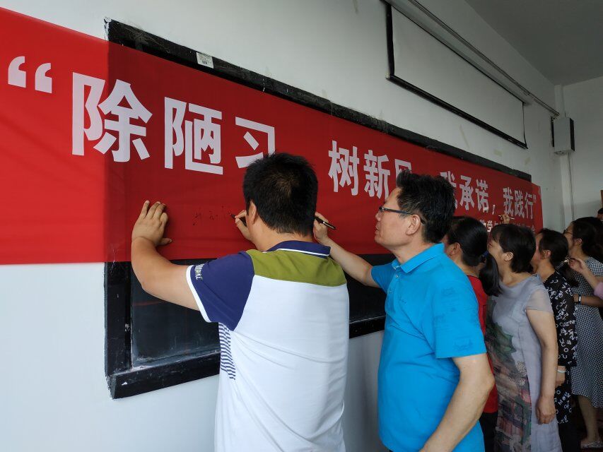 活动第二项“移风易俗树文明新风”签名,大家踊跃走上主席台,在“除陋习,树新风,我承诺,我践行”的红色条幅上签上自己的姓名。