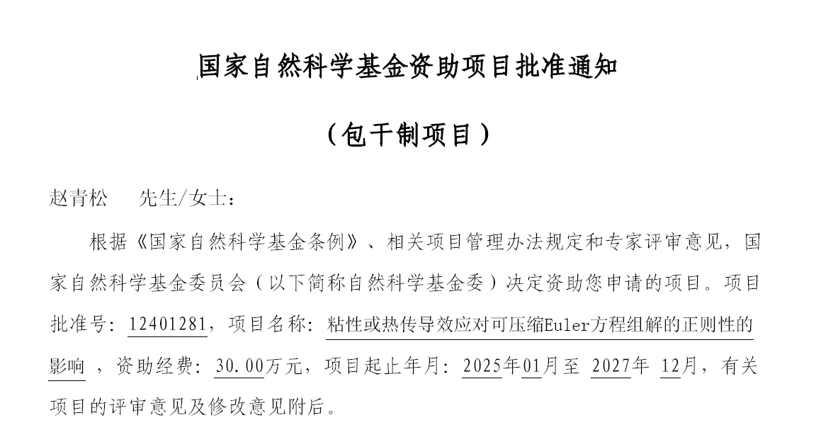 近日,国家自然科学基金委公布了2024年集中接收申请项目的评审结果,数理学院青年教师赵青松博士申报的青年基金项目《粘性或热传导效应对可压缩Euler方程组解的正则性的影响》喜获资助,资助金额30万元。