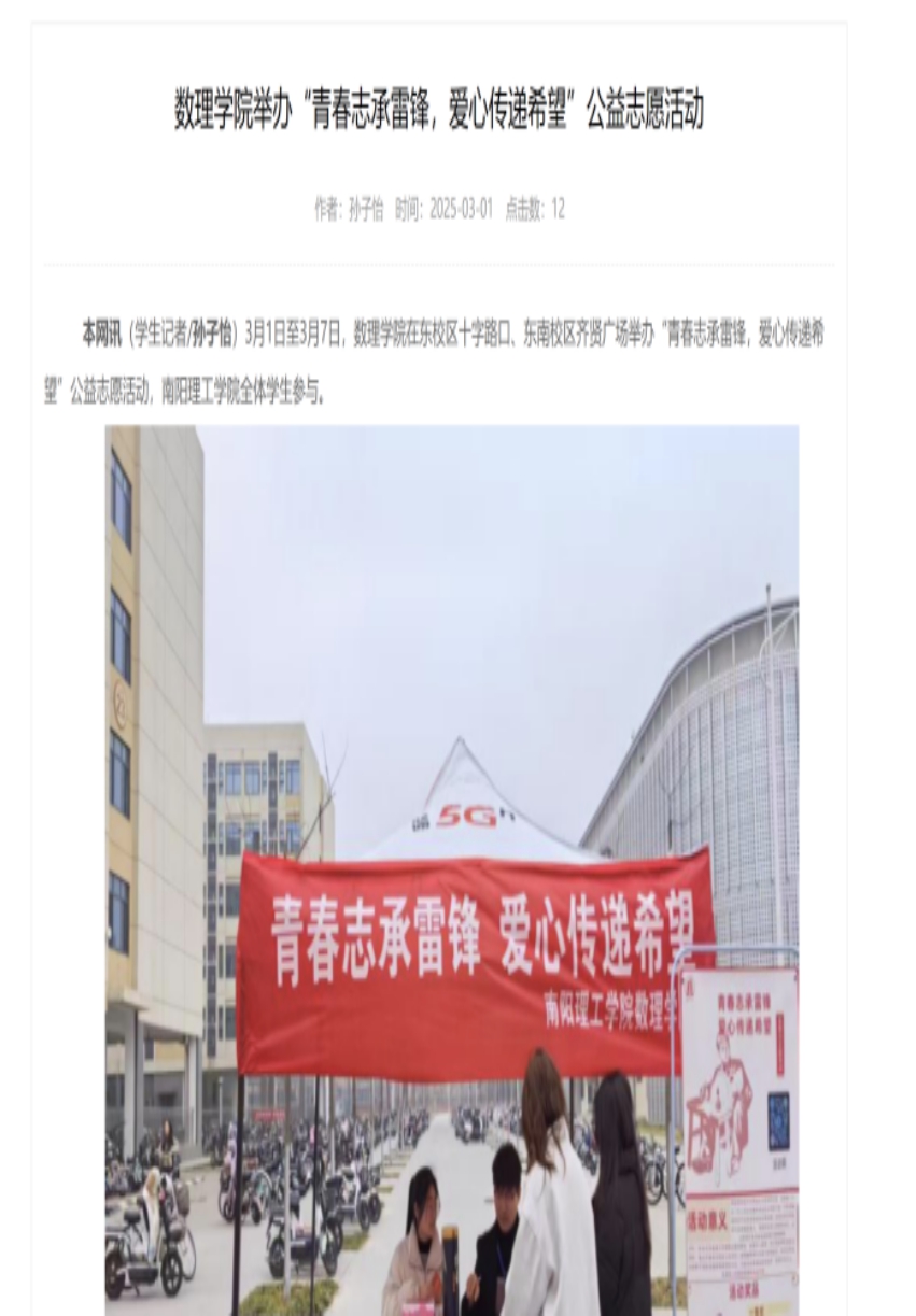 3月5日数理学院通过“数理青年之声”公众号转发《向雷锋同志学习》推文,引导学生学习雷锋精神。3月1日数理学院在学院官网上对志愿服务活动进行宣传报道,不断提升学雷锋志愿服务活动的关注度和辐射力。