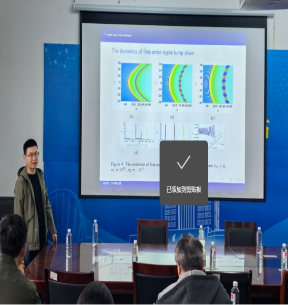 梁汉营教授在其关于“Varying-coefficient quantile regression with panel data and missing observation”的报告中探讨了面板数据和缺失观测值下具有固定效应的部分线性变系数分位数回归问题。解俊山教授在其关于“Power Enhancement Test on High-dimensional Regression Coefficients of Partially Linear Models”的报告中探讨了高维部分线性回归模型中回归系数的检验问题。曹玉雷、赵青松、路梦伟、佀荣荣、吴艳龙、靳心惠、李克明、乔申等8名博士围绕“非局域KP方程中的partial-rogue 波纹波解”“可压缩 Navier-Stokes-Poisson 方程组复合波的整体稳定性”“钠离子电池碳基负极材料的制备及其电化学性能”“生物滞留系统污染物溶解/再生策略构建木质纤维素衍生超级电容器电极研究”“卤化物固态电解质复合材料模块化设计机理和应用”“多级孔无机气凝胶材料的设计、合成及电化学储能特性研究”“面向生物质化学转化的多类型催化材料的开发及性能研究”“CL-20/硝基唑类含能共晶设计、制备与性能研究”等8个专题进行了探讨与交流。