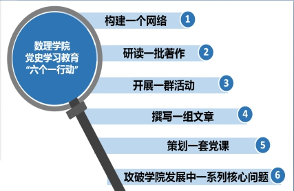“六个一”专项行动即构建一张网络:打造“学-思-懂-用”相结合的学习网络,每月一次集体学习,每月一次集中研讨,每月一次总结回顾;研读一批原著:对习近平《论中国共产党历史》《中国共产党简史》等指定学习材料进行深入学习;开展一群活动:开展党史学术讲座、演讲比赛、党史知识竞赛、志愿服务、重温入党誓词等活动,为师生办实事、解难题;撰写一组文章:支持、鼓励、引导全院师生撰写高水平党史理论阐释文章;策划一套党课:党委班子成员和各支部书记撰写学习心得,并推出系列党课向全院师生宣讲。攻破学院发展中的一系列核心问题:党政班子学以致用,学用结合,集思广益,责任到人,集中着力解决学院发展的若干问题。