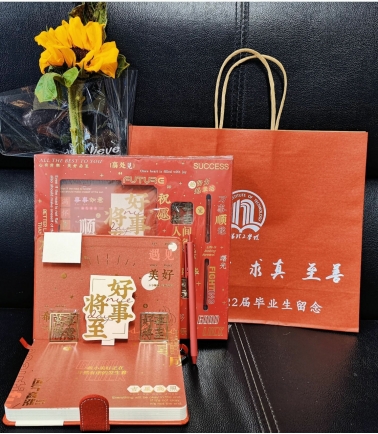 典礼开始前,大屏幕播放毕业生们拍摄的留念视频和老师以及学弟学妹们的祝福视频,视频带领毕业生回顾大学生活的美好时光。毕业班辅导员冯清在会场入口处为每个毕业生送上专属定制毕业礼物以示祝福。