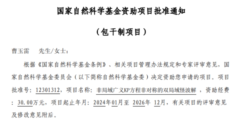 本网讯(特约记者/胡双年)8月24日,国家自然科学基金委公布了2023年集中接收申请项目的评审结果,数理学院青年教师曹玉雷博士申报的《非局域广义KP方程非对称的双局域怪波解》青年基金项目喜获资助,资助金额30万元。