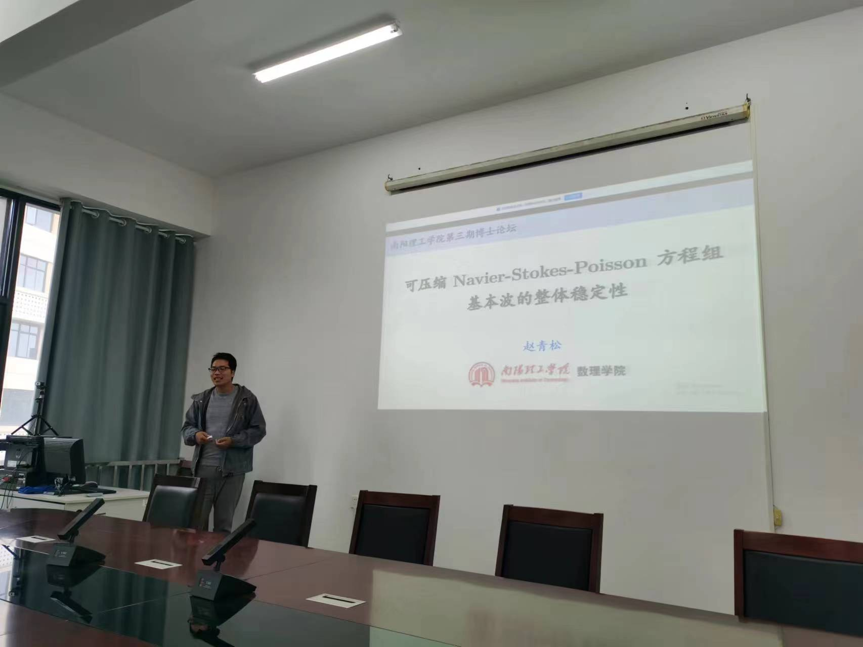 赵青松博士做了“可压缩Navier-Stokes-Possion方程组基本波的整体稳定性”的报告。