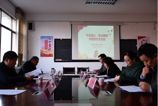 12月10日上午8:30,数学与统计学院领导班子在会议室召开“不忘初心、牢记使命”专题民主生活会。校党委委员、副校长肖泽昌、学生处副处长赵东江出席会议,会议由数学与统计学院党支部副书记陈同勉主持。