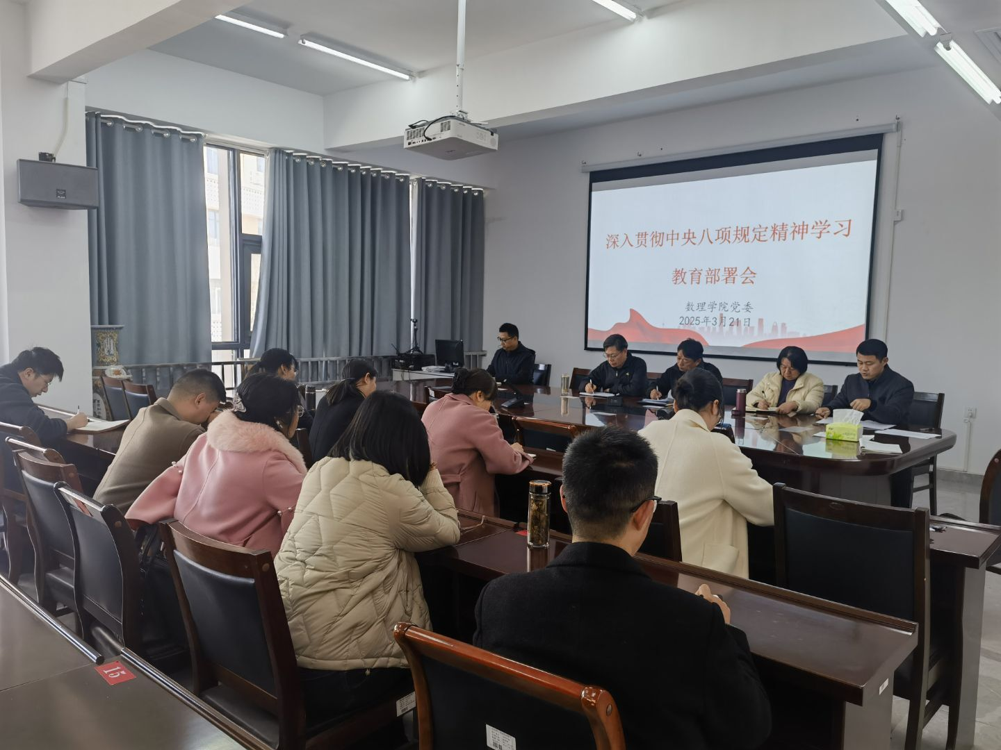 2025年3月21日上午,数理学院在17号楼310会议室召开深入贯彻中央八项规定精神学习教育部署会。数理学院全体科级以上干部参加此次会议,共同深入学习并落实学校发布的《关于在全校党员中开展深入贯彻中央八项规定精神学习教育的工作方案》。