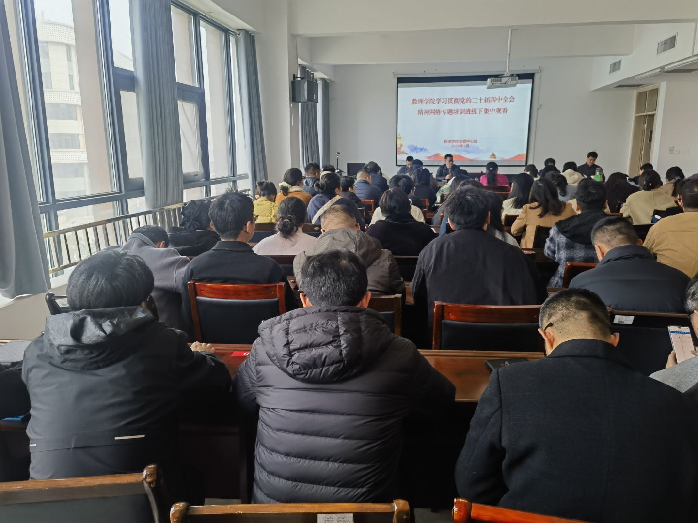 2026年3月24日,数理学院党委在17号楼310会议室召开全体党员大会,由学院党委书记牛军科带领学习贯彻党的二十届四中全会精神网络专题培训班相关内容,覆盖学院全体师生党员、科级及以上非党员干部,以“高标准组织、全覆盖参训、深层次转化”为原则,扎实推进培训工作走深走实。