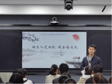 本网讯(学生记者/陈瑞雯 赵婧辛)4月7日至4月14日,数理学院举办了第四十八期党课培训。此系列培训分别由学院党委书记牛军科、院长郭学军、党委副书记赵刚彬、分团委副书记冯清主讲。