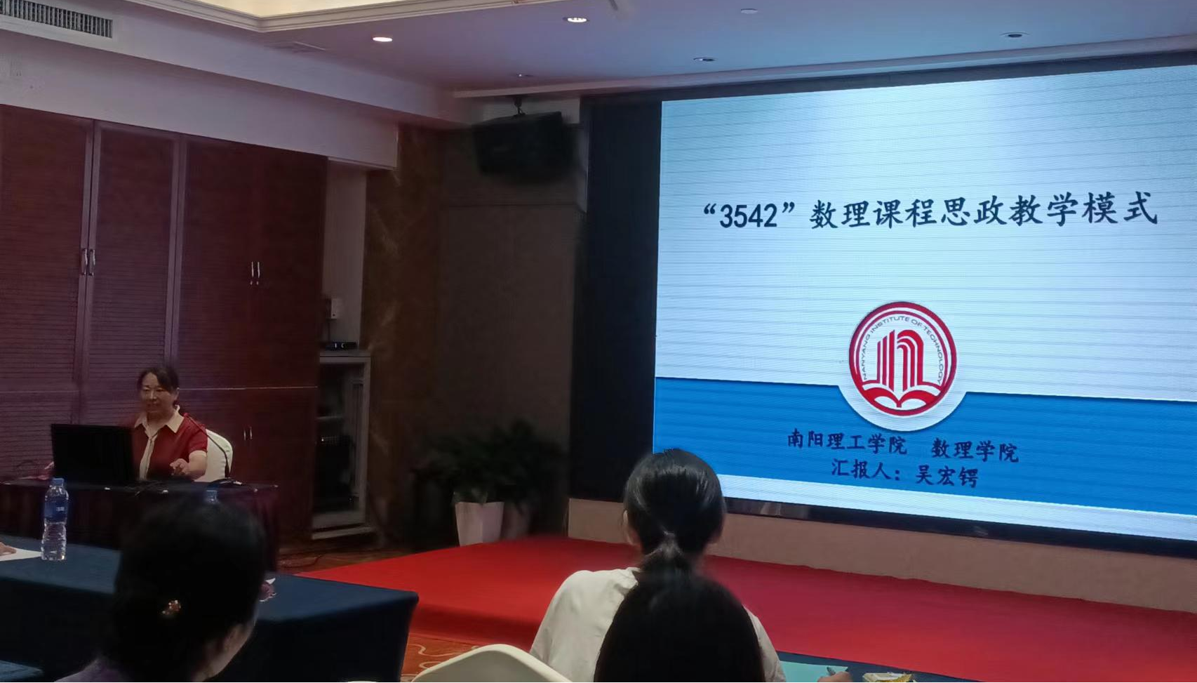 在工作坊里,数理学院副院长吴宏锷作为河南省数理课程思政教学示范中心负责人,做了课程思政汇报。她以《概率论与数理统计》课程为例,从对课程思政的认识开始,结合自身长期教学经验和课程思政教学设计,详细阐述了“3542”数理课程思政教学模式的实施及效果,并在最后发出“有爱就有思政,有思政就有爱”的感悟。