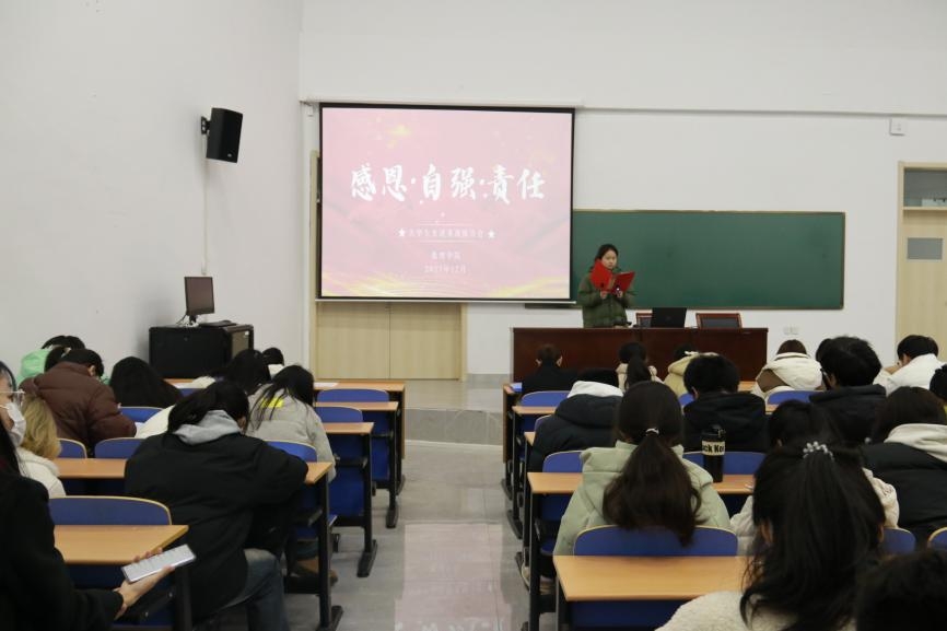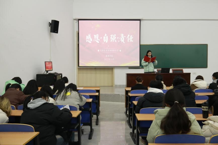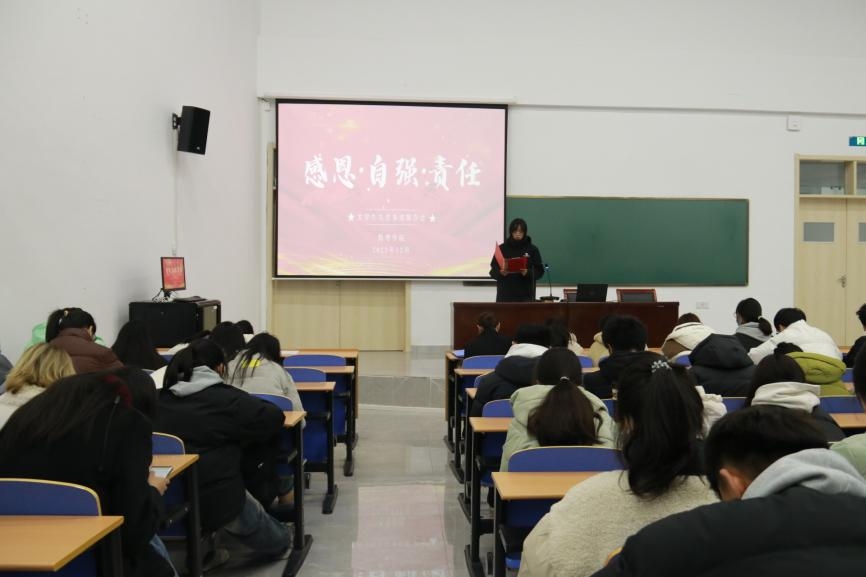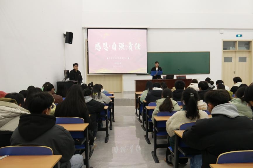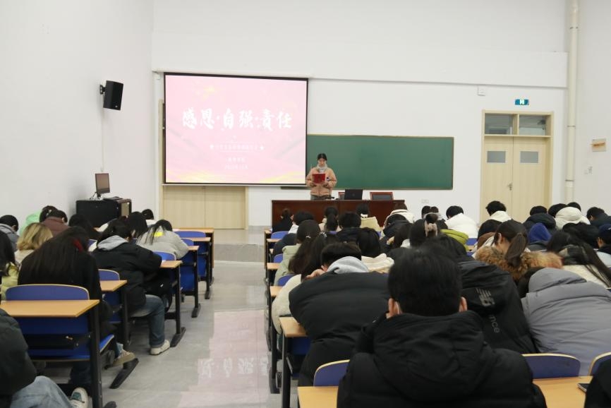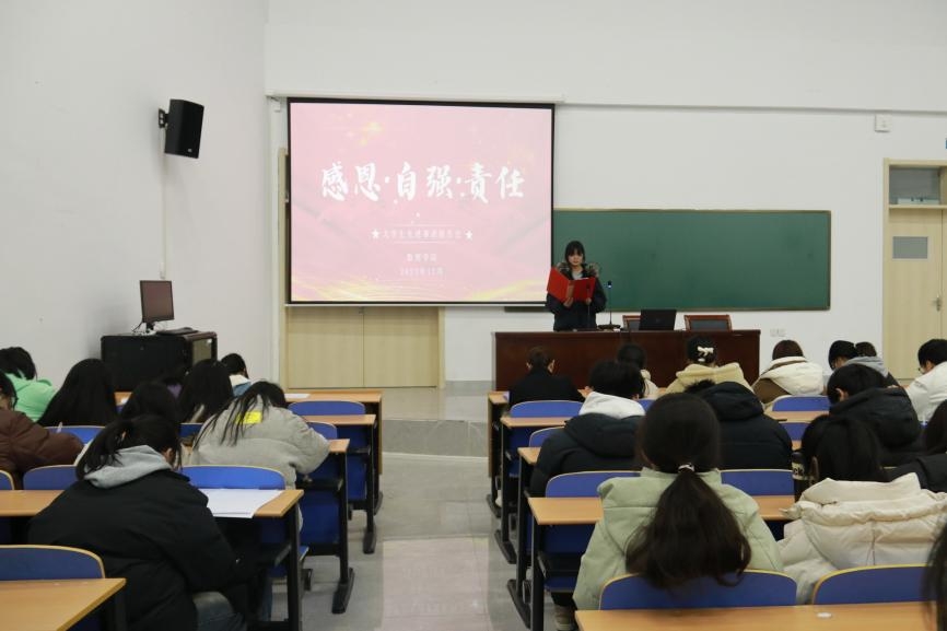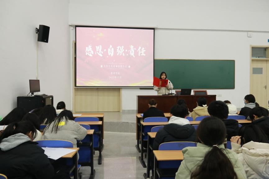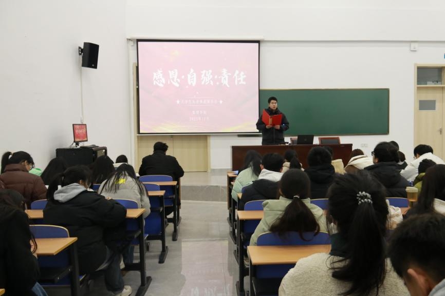 本网讯(学生记者/向双贵)为发挥榜样的示范和引领作用,引导学生全面提升自身素质,12月23日,数理学院在17教115开展第十五届“感恩·自强·责任”大学生先进事迹报告会,23级全体学生参加。