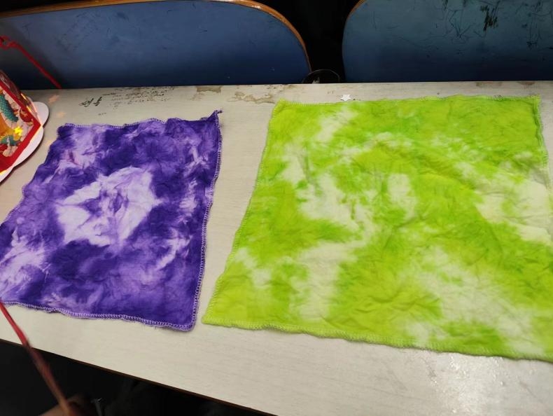 中华文明五千年来孕育出了灿烂的文明和艺术,而扎染就是这璀璨群星中的一颗。这项文化发源于秦汉,流传至今依旧彰显着它蓬勃发展的生命力,成为中华文明一张光彩夺目的名片。巧手扎锦缎、布里染传承。当染色遇上融合,当传承遇上温暖,当思想发生碰撞,创意的火花在实践中绽放。为了传承中华艺术瑰宝,弘扬民间传统文化,丰富校园文化生活,让更多的学生了解“非遗”文化,12月28日,数理学院举行“非遗小课堂”体验扎染活动。