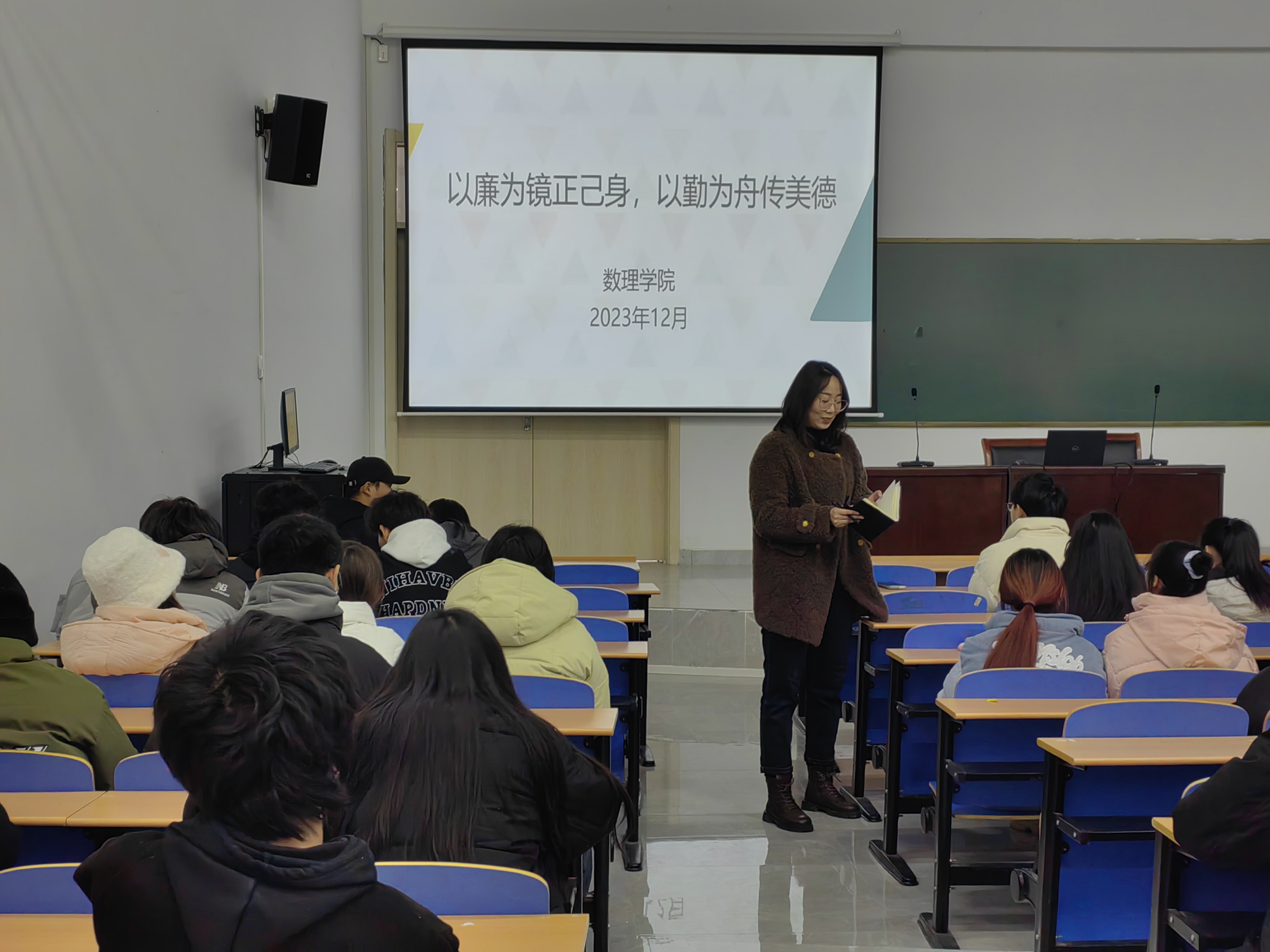 本网讯(学生记者/赵小雯)为加强同学们的廉洁自律意识,弘扬风清气正的校园环境,12月29日,数理学院在17教115开展“以廉为镜正己身,以勤为舟传美德”主题班会,本次班会由辅导员冯清主讲,22级全体同学参加。