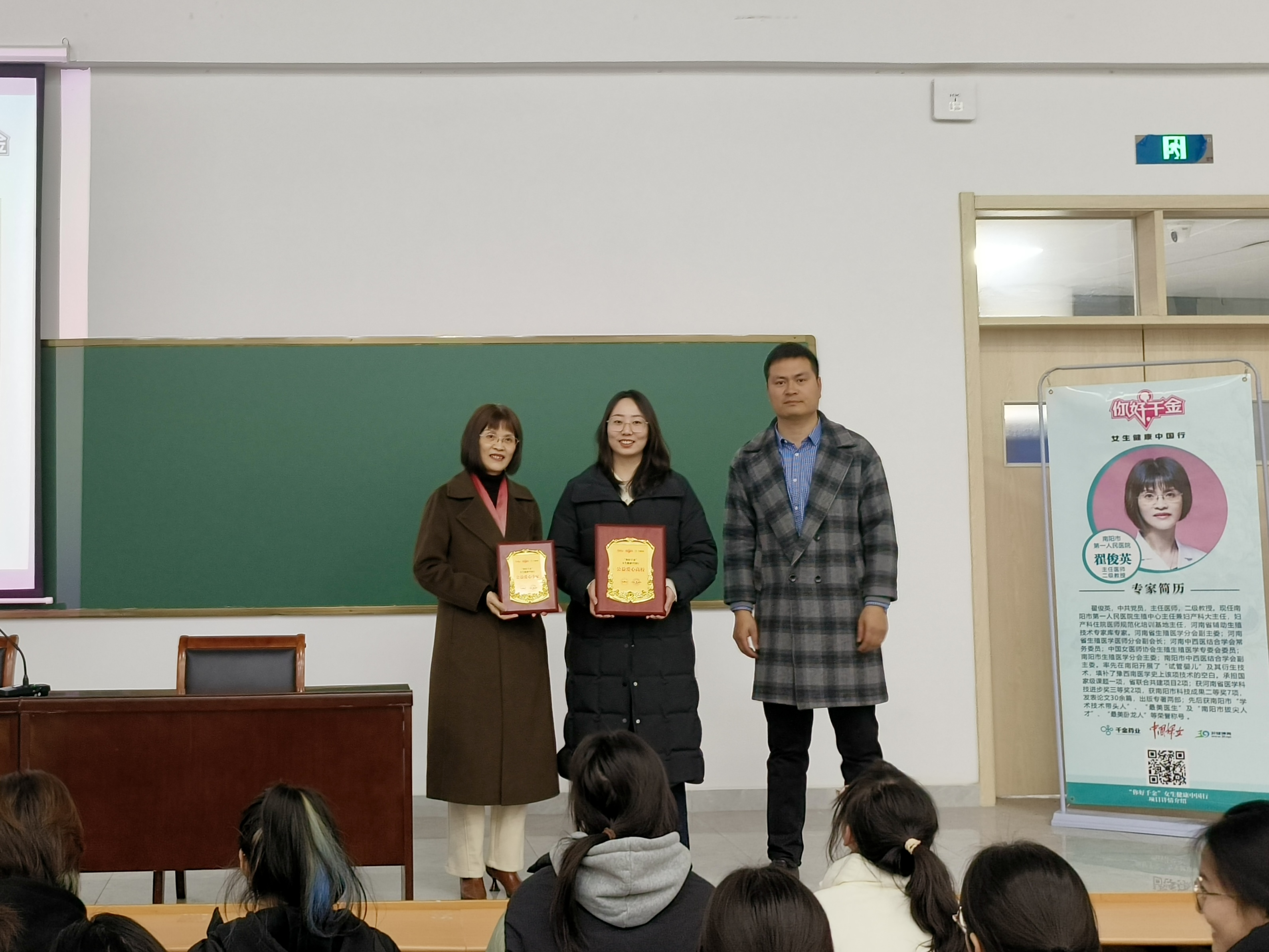 活动中,“你好千金--女生健康中国行”公益项目组为翟俊英主任颁发了“你好千金”女生健康中国行公益爱心专家奖牌并授予我校公益爱心高校奖牌。