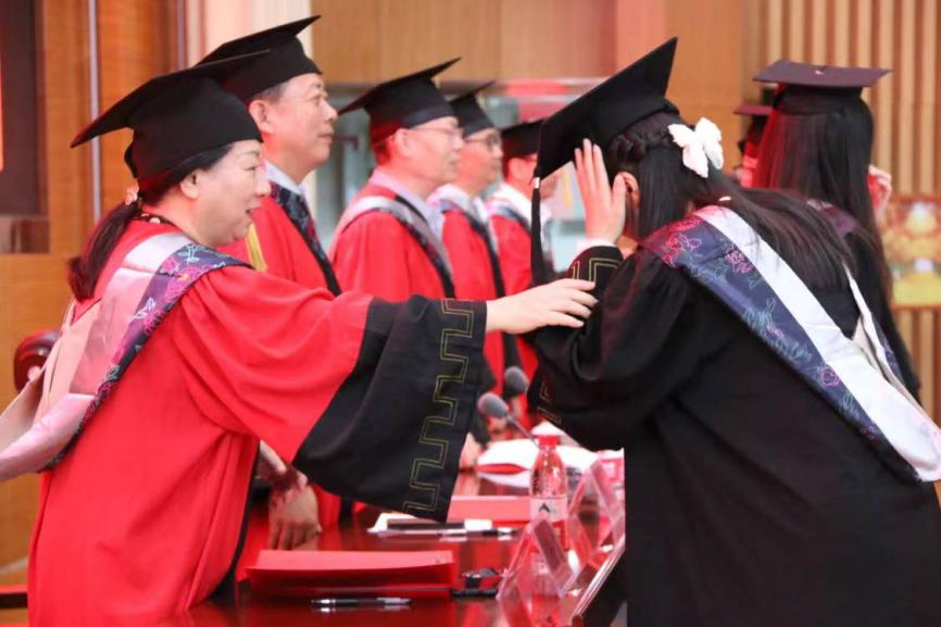 学院领导为毕业生拨苏正冠,毕业生们身着学位服,头戴学位帽,逐一上台接受拨穗礼,标志着他们正式完成了学业,迈向新的人生阶段。