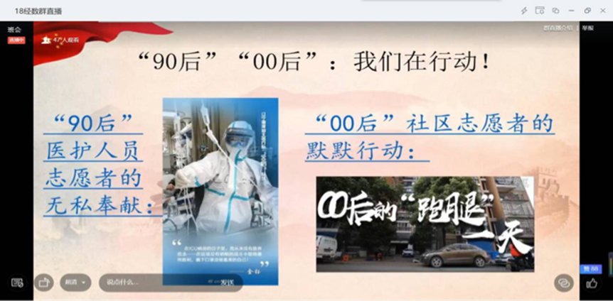 19经数班团支书播放了一段视频,视频中同学们看到了各省自愿支援到前线的战士们的身影,他们报身国家,不惧任何艰难险阻。学生积极在线上进行了讨论,纷纷表达了自己对援鄂医疗队的敬佩之情。一位同学分享道:“‘90后’青年一代,曾经在网络遭受过许多质疑与批判,但在疫情面前,他们用实实在在的行动证明了自己。我们‘00后’也应如同他们一般,不负祖国希望,尽自己的一份力,为党为人民,奋斗拼搏。不惧,本是青春模样;不退,彰显青年担当。”