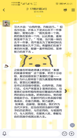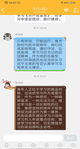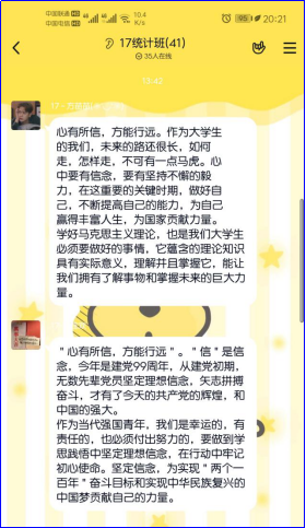 17经数班在团支书的带领下,认真学习习近平总书记给复旦大学志愿服务队的回信内容,同学们纷纷积极参与到学习交流当中。一位青年团员有感而发:“正所谓:‘心有所信,方能行远。’只有理想信念坚定的人,才能不怕千难万险,矢志不渝的为实现梦想而奋斗,做到在新时代的长征路上奋勇前行,将个人理想追求融入国家和民族事业中!”