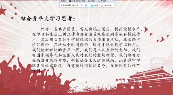 本网讯(特约记者/冯清学生记者/刘欣雨、陈思桦)为强化我院团员青年思想引领工作,引导团员在思想、行动上向党员看齐,发挥团员模范带头作用。7月4日,我院大一至大三各班组织全体青年党员和团员在线学习总书记“回信精神”,以实际行动践行习近平总书记对青年人的要求。