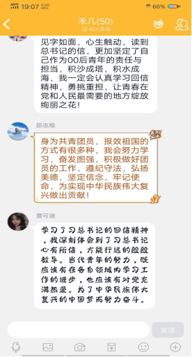 19统计班在团支书的带领下,进一步体会到了“回信精神”,同学们对此展开了热烈的讨论。一位同学表示:“通过此次学习,我了解到了身为新时代的大学生身上肩负的使命与责任。我们应当起到主力军的作用,激扬青春力量,勇于青春担当,创造青春业绩,积极践行社会主义核心价值观,将五四精神继承下去。”