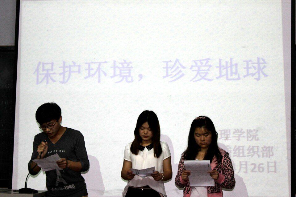施安等三位同学带来的深情朗诵为本次团学活动拉开序幕。吴少华演唱流行歌曲《棉花糖》,流畅悠扬的曲调、轻快活泼的节奏再加上他温暖深情的吟唱,令同学们沉醉不已;视频《地球母亲》紧紧扣住本次团学活动的主题——保护环境,珍爱地球,让同学们了解到保护“地球母亲”的必要性和重要性;温明深情演唱歌曲《可以了》,清朗的歌声中略带忧伤,其认真的表情、动听的歌声赢得在座同学阵阵掌声,也将团学活动推向高潮;王嘉琪通过演讲《保护地球》来讲述如今环境的恶化,深情呼吁同学们保护环境。最后,在《热爱地球妈妈》的动听歌曲中,团学活动落下帷幕。