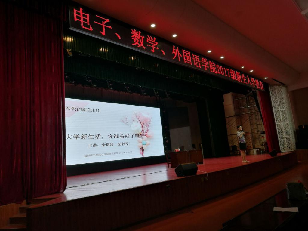 本部讯(学生记者/张捷) 9月19日晚上七点半,南阳理工学院心理健康中心余瑞玲副教授在小礼堂给数学与统计学院、电子与电气工程学院和外国语学院讲授关于新生入学的心理教育讲座。近800名学生聆听了本次讲座。