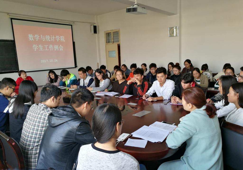 本网讯(特约记者/冯清学生记者/李宁)10月24日中午,数学与统计学院召开了以“新闻培训”为主题的学生工作例会。数学与统计学院党委副书记陈同勉、14级辅导员胡丽、17级辅导员冯清以及学生会全体学生干部和各班班长、团支书参加了此次会议。