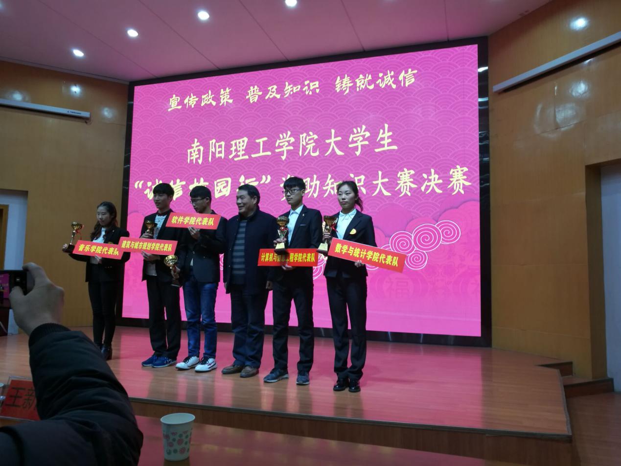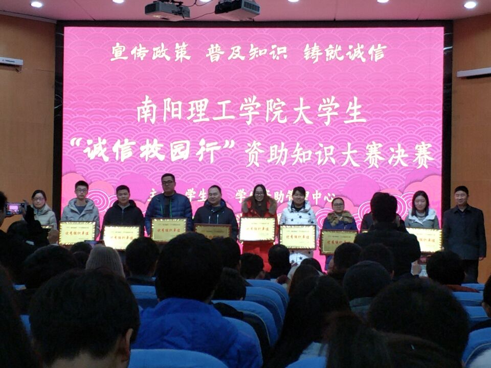 此次大赛由校学生处、学生资助管理中心主办、经济管理学院承办,以“宣传政策、普及知识、铸就诚信”为主题。我院何佳欢、曹书凡、蒋雅彬、顾珺、马海然五名同学通过初赛复赛的层层选拔,最终成功晋级进入决赛。决赛分两场进行,分为个人必答题、抢答题、集体必答题及风险题等五个环节。比赛过程中,我院几名选手全场配合默契、沉着冷静。结果虽不尽人意,但仍得到了在场观众阵阵热烈的掌声。经过激烈对决,何佳欢同学由于表现突出被评为我院的优秀选手。最终我院荣获三等奖以及“优秀组织单位”称号。