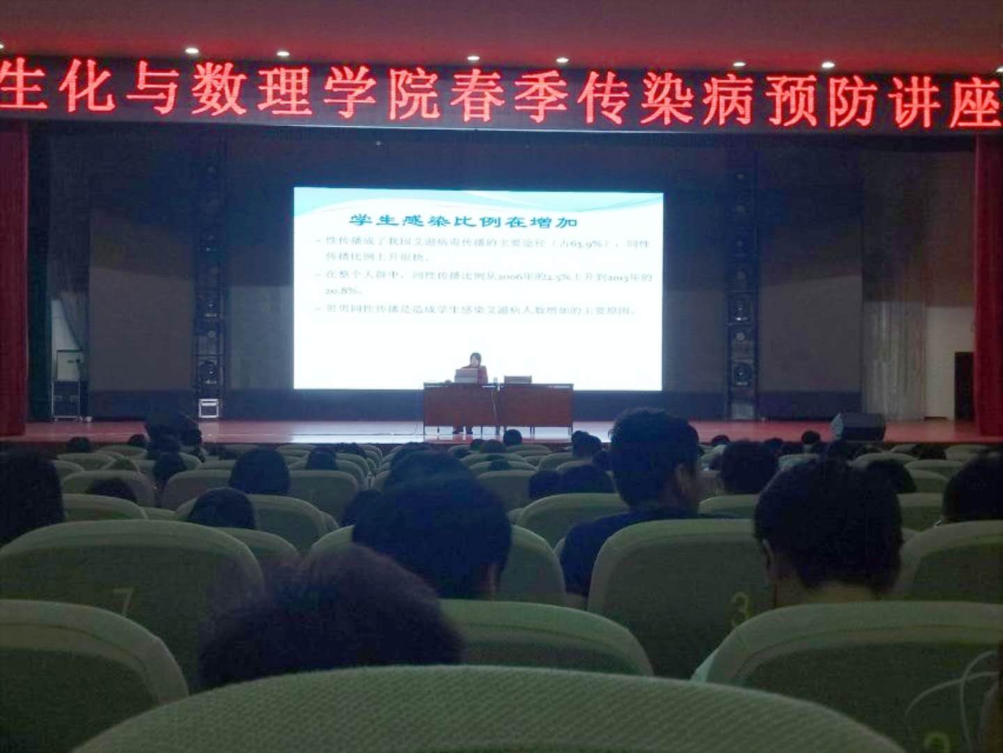 本网讯(特约记者/冯清 学生记者/尹思佳)为进一步加强学生传染病预防的相关意识,4月3日,生物与化学工程学院和数学与统计学院在毕业大厅联合开展春季传染病预防讲座。近800人聆听本次讲座。