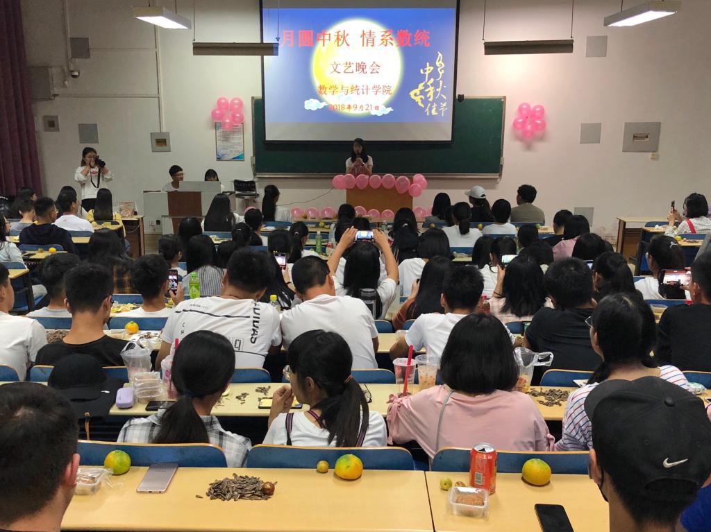 本网讯(特约记者/冯清 学生记者/罗琳燕)9月21日晚,数学与统计学院在十四教二阶六教室举办了以“月圆中秋,情系数统”为主题的文艺晚会。晚会由2018级新生孙博华、胡晓莉主持,数学与统计学院近百名师生参加。