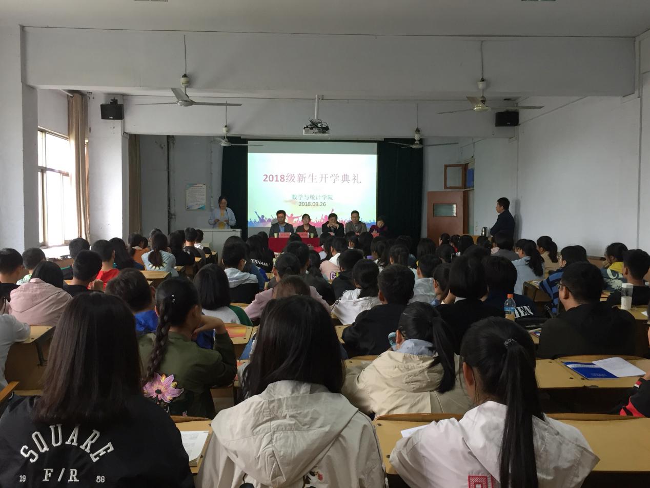 本网讯(学生记者/符豆豆)金秋送爽,丹桂飘香。9月26日下午,数学与统计学院2018级新生开学典礼在1教1515教室举行。本次开学典礼由王满主持,院长朱玉清、副院长郭学军、牛玉俊、党总支书记秦道岭、党总支副书记陈同勉出席开学典礼,2018级全体新生参加。