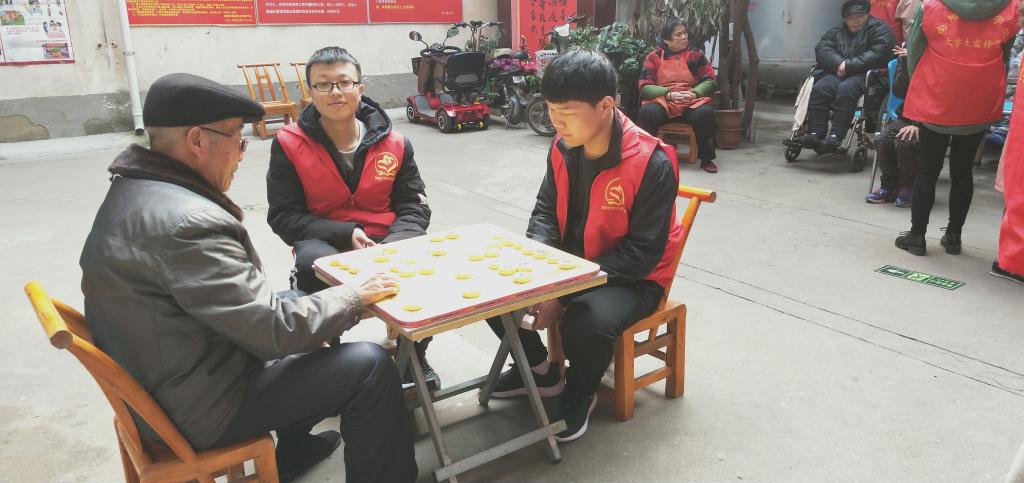 下午2点30分,志愿者们来到养护中心,看到老人们在一起听豫剧、晒太阳、聊家常,小小的白墙红瓦院里一片怡然自得的景象。志愿者们在进行简单的介绍和交接之后便开始了本次志愿服务:一部分志愿者打扫养护中心,一部分志愿者陪老人们听豫剧、剪指甲、捶背、聊天,还有一些会下棋的志愿者陪老人们下棋。志愿者们最喜欢听老人们讲述他们的人生经历,通过老人们的故事了解时代的变迁和社会的变化。同时,志愿者们也会把自己的家乡、学习和生活情况讲给老人们听,养护中心不时传出阵阵欢声笑语。