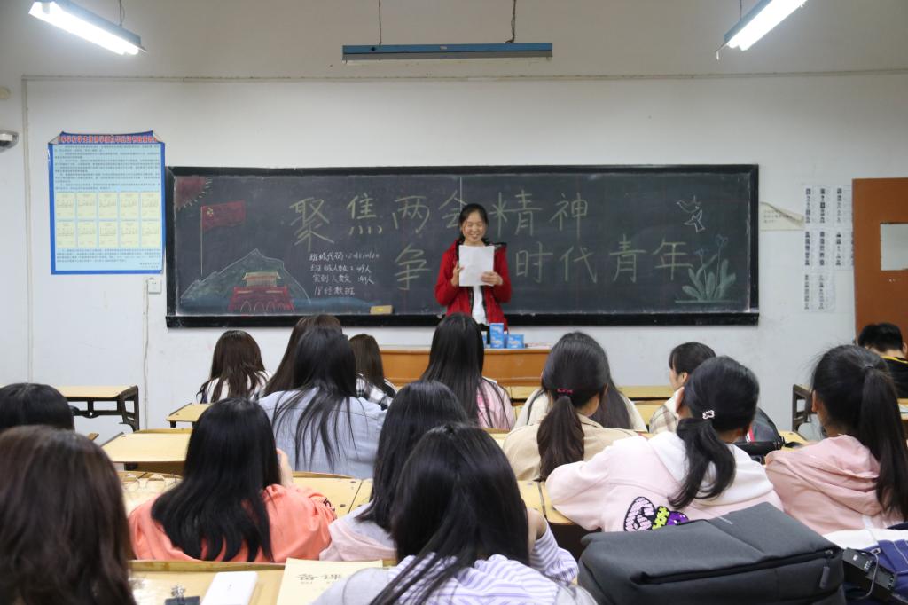 本网讯(学生记者/王雅芬、李霜)4月21日晚,我院18级统计班和经数班分别在1号教学楼1506教室和1510教室里,开展了以“聚焦两会精神,争做时代青年”为主题的班会。本次班会18级全 体同学参与。