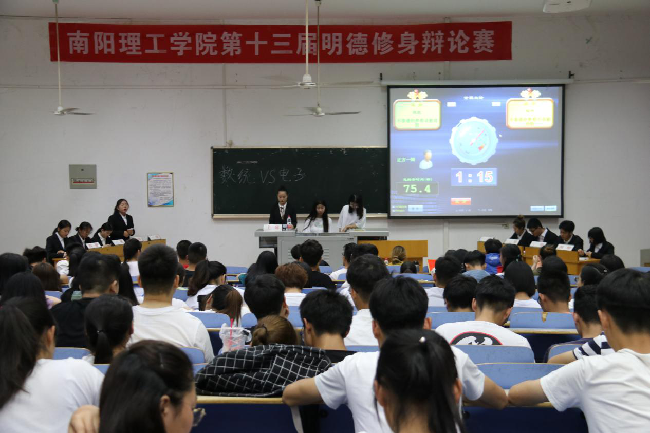 本网讯(学生记者/王雅芬)5月16日晚上7点,我院辩论队成员与电子与电气工程学院辩论队队员在六号教学楼六阶二教室举行明德修身辩论赛。本次辩论赛的主题是“不靠谱的梦想应不应该被劝阻”。本次辩论赛有近两百名同学观看。