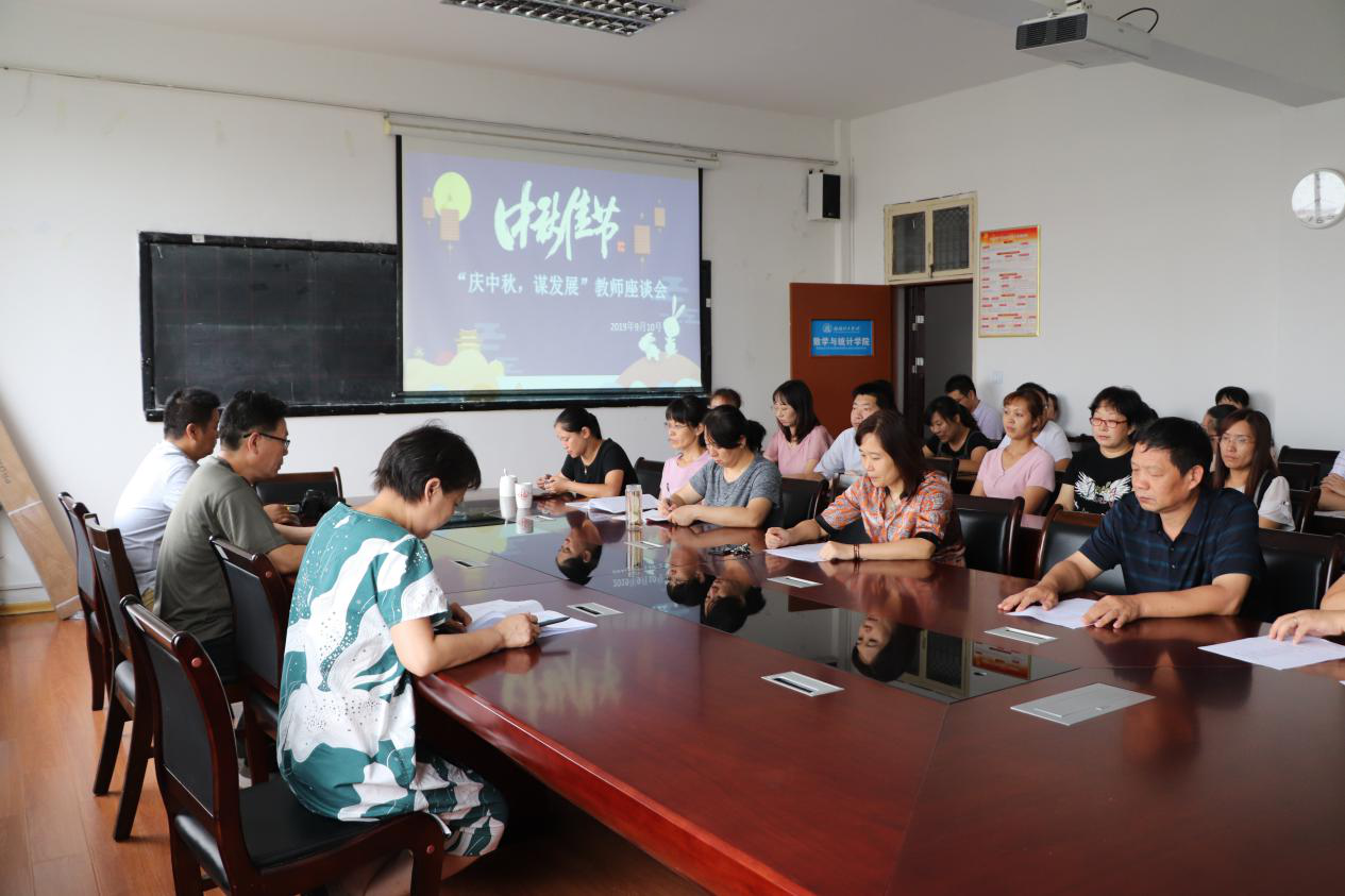 紧接着,借着浓烈的团圆氛围,开始了“庆中秋,谋发展”教师座谈会。本次座谈会由副书记陈同勉主持,老师们围绕学院的发展畅所欲言、献计献策,副院长郭学军又将本学期的教学重点进行了安排部署。本次座谈会为我院的建设和发展起到了推动作用。