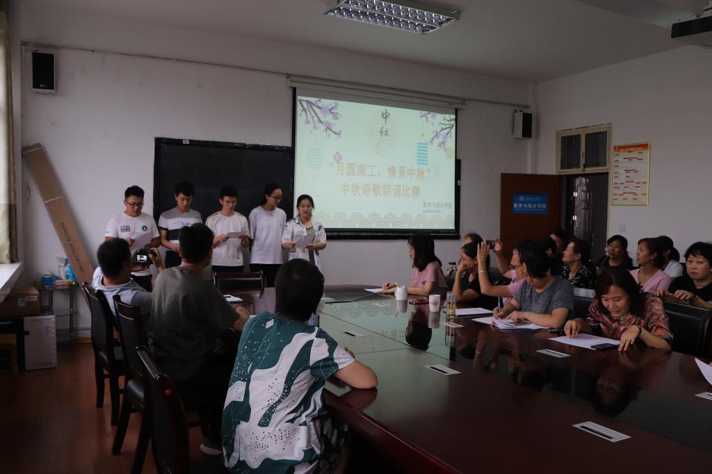 下午三点,我院老师们和学生代表齐聚会议室,开展“月圆南工,情寄中秋”诵读比赛,首先由学生代表朗诵《桃李满天是给您的回报》,为老师们送上教师节和中秋节的“双节”祝福。接着由老师代表李瑞阁和王国欣朗诵《水调歌头》、仝云旭和刘阳朗诵《八月十五夜月》、乔俊峰朗诵《美丽中国》等,一首首动人心弦的诗文抒发着大家对亲人和故乡的思念,以及对祖国的美好祝福。
