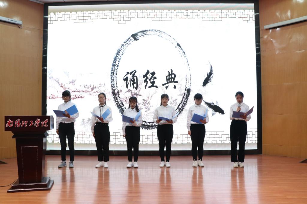 第四个环节是“诵一段经典”。由董妞、刘彦娟、胡晓莉、刘留、王艳、肖露露为大家朗诵《中国少年说》。她们的朗诵声音洪亮、感情饱满、声情并茂,充分展现了当代大学生意气风发,豪气冲天的气质。也让在场同学为之振奋,坚定了为祖国发展、民族复兴而努力奋斗的信念。
