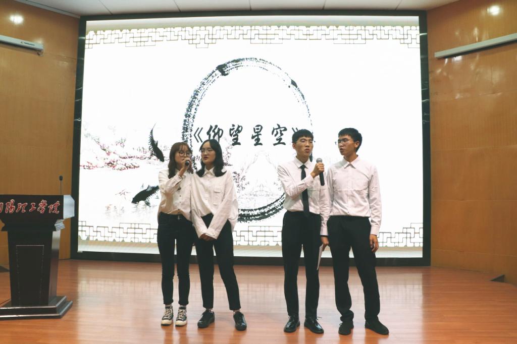 活动第一环节是“唱一首歌曲”。歌曲《仰望星空》由刘欣雨、徐辰琳、刘志坚、徐波领唱。这首歌曲启发同学们不仅要仰望星空,着眼未来,更要脚踏实地,奋力拼搏。