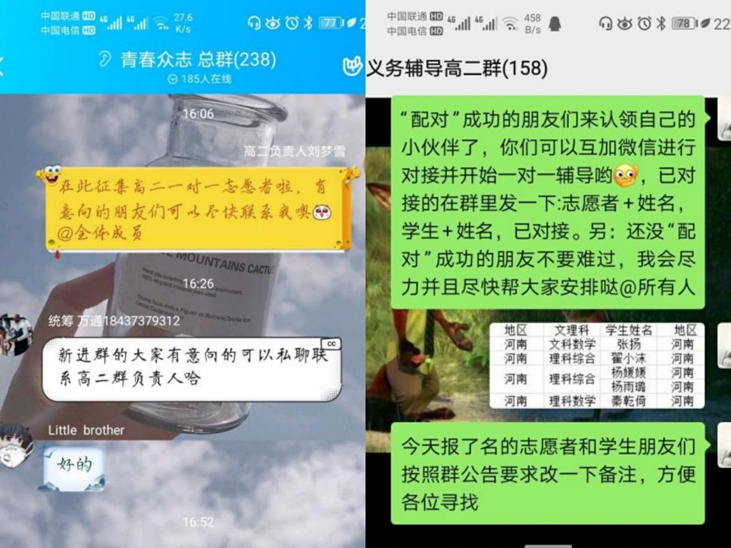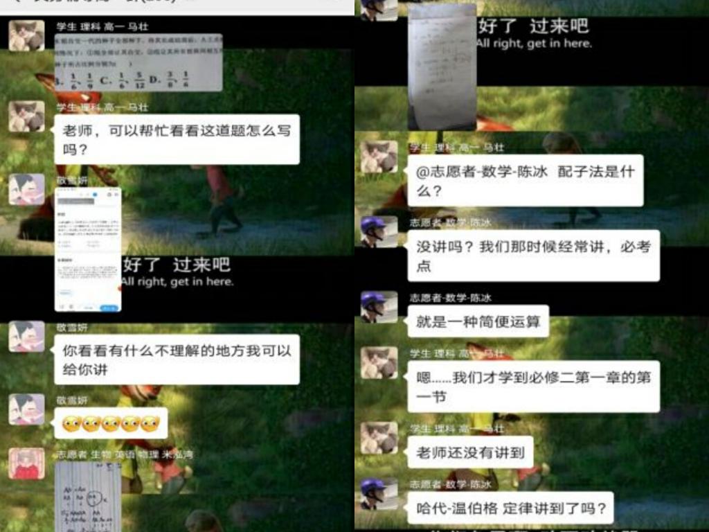 因受疫情影响,大多数学生学习上出现难题无法解决,从而影响学习进度。1月28日,我院2017级统计班团支书、入党积极分子刘梦雪同学在网上看到一则征集大学生志愿者的帖子,就立刻联系了发帖人,并且加入了志愿者团队。之后,刘梦雪与“青春众志,教育守护成才”志愿者团队开始招募由大学生、研究生、老师组成的志愿者队伍,组成了不同年级学业辅导群,并增设了心理健康辅导群。刘梦雪现担任青春众志高二年级负责人,和其他志愿者一起,通过微群解答同学们的问题。另一方面,根据同学们的需要,刘梦雪还帮助大家挑选一对一辅导老师,更有针对性地进行辅导。