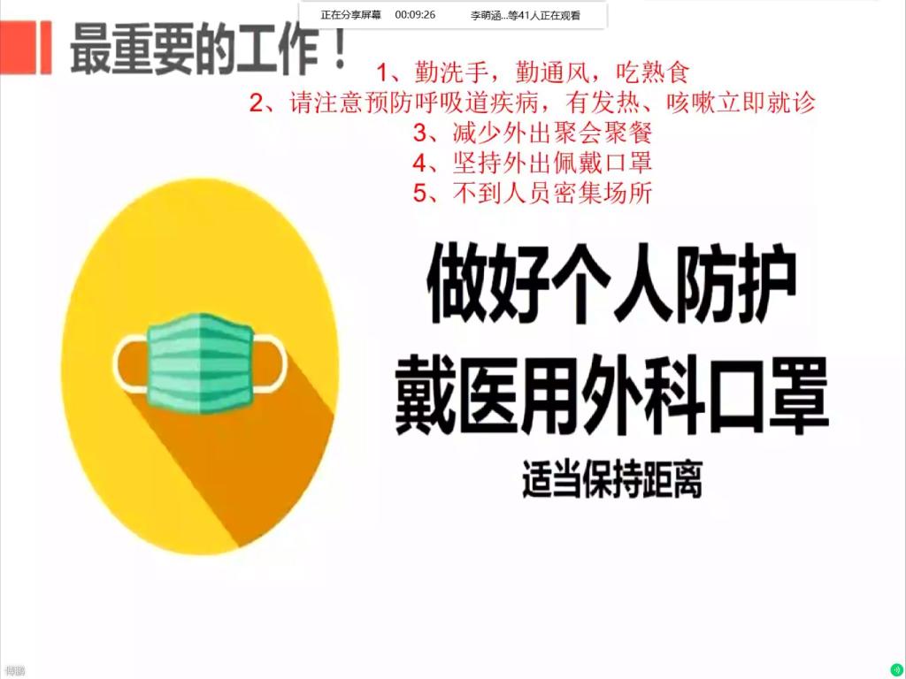 班会过程中,主持人对新型冠状病毒相关知识、新冠肺炎感染症状、预防感染措施以及新冠病毒与SARS病毒的区别等内容进行了详细的讲解,提醒同学们,虽然疫情有所好转,但仍不能掉以轻心,继续遵守居家防控的规定,不外出、不聚集,勤洗手、戴口罩,保护好自己。同时,要求同学们在家上课期间要充分利用在线课程平台,坚持读书学习和思考研究,做到停课不松懈、学业不停歇。最后,主持人和大家一起学习了《阳光心态,抗击疫情——河南省高校师生心理应对手册》,了解到面对疫情我们需要提高自我认知、认识应激、接纳焦虑、寻找资源、用积极信念调整心态。并学会用腹式呼吸放松法、安全平静技术、蝴蝶拍术等方法来调整自我情绪,提升自我管理,安心抗疫。