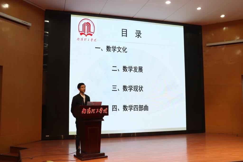 旷永鑫同学为大家分享《浅谈数学文化》主题报告。他从数学文化、数学发展、数学现状和学好数学四部曲,四个方面为同学们指点迷津。通过人生的哲理公式,让同学们更好的理解“多百分之一的努力,得千分收成”的道理。将数学与电竞行业结合,为大家介绍电竞行业中的数据分析师职业。讲解数学与人工智能之间的关系,他指出,人工智能的本质,实际上就是数学、概率论、统计学以及各种数学理论。报告条理清晰,语言风趣幽默,赢得大家阵阵掌声。报告结束,我院副院长郭学军为旷永鑫颁发优秀校友聘书,并合影留念。