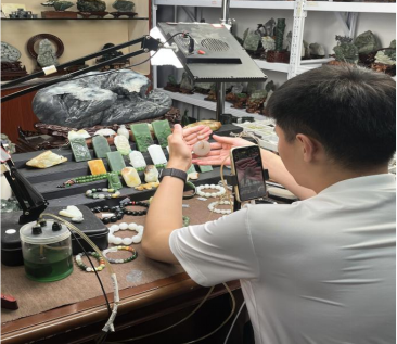 在镇平县石佛寺镇苏艺珠宝,实践队员们观摩了不同种类玉器直播间的情况,深入了解了直播带货的硬件准备、内容策划、话术技巧等内容。相关负责人为大家详细介绍了镇平玉雕的发展史、玉器品种、销售模式等。据了解,石佛寺镇虽不出产玉石,但却是“全国最大的玉雕加工销售集散地”和“玉文化传播中心”,拥有“中国玉雕之乡”的美誉。目前,石佛寺镇的玉雕产品已深度融入电商生态,全镇电商企业6800余家,淘宝、抖音等大小直播间3000余家,电商从业人员5万余人,2024年全县电商交易额突破380亿元。但随着市场变化和消费者需求的多样化,也出现了如专业电商运营人才匮乏、玉雕设计与创新人才不足、易碎品物流配送成本高、传统技艺传承面临挑战等难题。