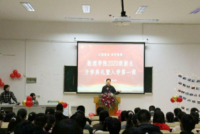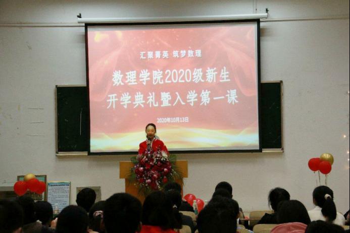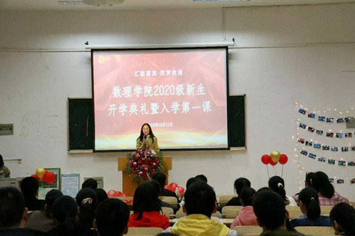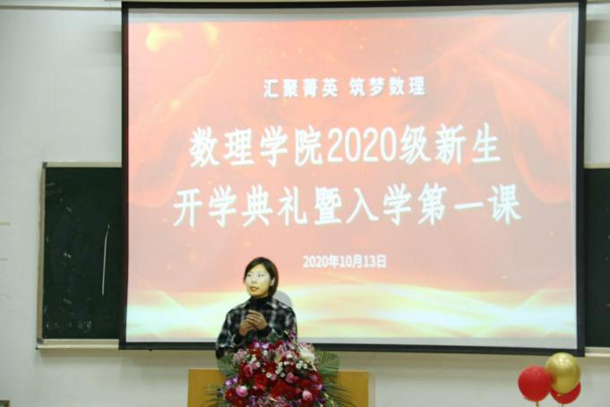本网讯(学生记者/崔梦恬 黄榕溶 刘欣雨 陈思桦)10月13日晚,我院在7号教学楼201教室举行“汇聚菁英,筑梦数理”2020级新生开学典礼。学院全体班子成员、辅导员、教师代表及2020级学生参加,典礼由党委副书记王锦瑾主持。