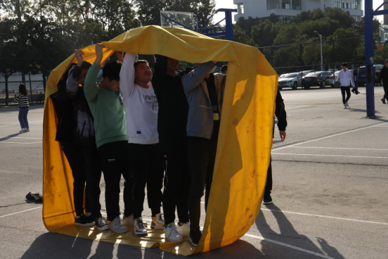 本次素质拓展活动有车轮滚滚、接力传球、同心鼓、不倒森林等六个游戏组成,同学们6人一组有序地进行各个游戏。在“车轮滚滚”游戏中,四至六名队员站在一条履带内,从起点线开始,通过手和脚的协调配合,直到小组内所有成员到达终点线后结束,用时最少的队伍获胜。虽然在前进过程中,总会有履带掉落的情况,但组内队员都会及时调整姿势和方法,集中精力顺利完成。