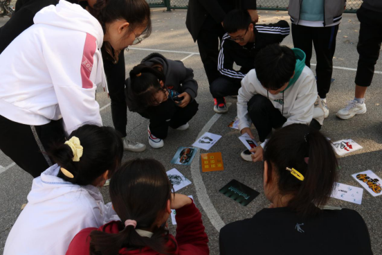 紧接着是游戏“快猜30”。首先由每组负责人将卡片放在圈内,只能有一个人进去排序(1-30),其余人员不能进入圈内,但是可以指挥圈内的人拿卡片。照片上有相关数字提示,小组成员通过推测将卡片数字排成正确顺序,最先完成的一组获胜。游戏过程中,大家非常投入,仔细观察、讨论,积极寻找提示线索,争取自己的小组最先完成任务。