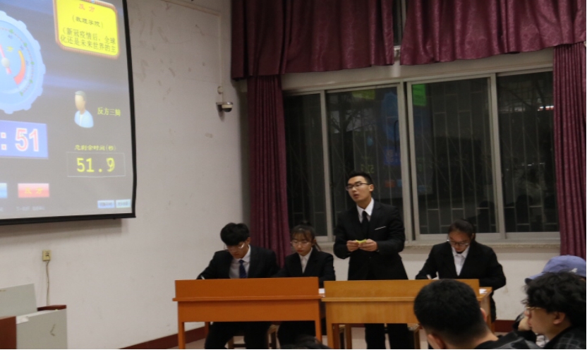 在我院徐辰琳同学进行简短的开场后,本次辩论赛正式拉开了帷幕。正方辩手为土木工程学院学生代表,观点是“新冠疫情后,全球化不是未来世界的主要趋势。”反方辩手为我院学生代表,观点是“新冠疫情后,全球化还是未来世界的主要趋势。”首先由双方一辩进行观点立论,正方一辩首先就新冠疫情后,全球化是否能满足人类发展,且有一种更好更新的模式能够替代全球化,提出了人类命运共同体和单边主义的概念等进行论述。反方一辩则认为新冠疫情后,只有经济全球化才能大幅度弥补在新冠疫情中经济的损失,且全球化促进文化的交融以及政策的交流。接下来的几个环节里,双方皆备战充实,你来我往,互不相让,秉承各自观点进行了激烈的对战。其中反方三辩赵甲骥同学的提问环节精彩犀利,他问到,疫情之后全球化为更多的国家带来了技术和资金,解决他们精彩止步的问题,难道能够否认这一点吗?让对方辩手一时语塞。紧接着,激动人心的自由辩论环节再次将比赛气氛推向高潮,正反双方侃侃而谈,尽显风采。随后在观众畅所欲言环节,现场热心观众就双方论点提出了自己各自的问题与看法,并表示此次辩论给大家带来了一场精彩视听盛宴。
