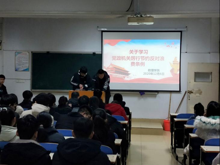 本网讯(学生记者/温尉雅)为引导同学们学习、贯彻习近平总书记“厉行勤俭节约,反对铺张浪费”的讲话精神,强化对学生们的思想引领和行为规范,12月6日,我院在13教514开展关于《党政机关厉行节约反对浪费条例》的学习活动。全体学生组织成员参加活动。