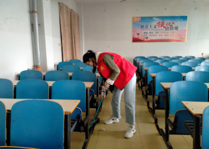 志愿者们认真地打扫教学楼
