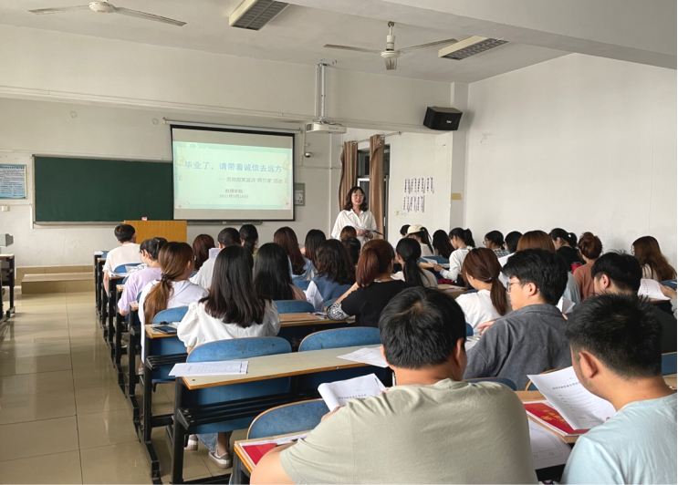 本网讯(学生记者/韩瑞丽)5月18日,我院在13教614开展资助政策宣讲“两节课”之“毕业了,请带着诚信去远方”活动。本次活动由我院团学办副主任冯清主持,2021届全体毕业生参加。