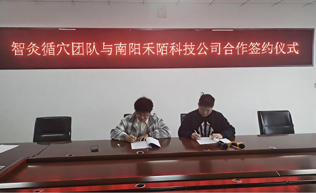 本网讯(学生记者/张洛杰)2025年3月15日,南阳理工学院“智灸循穴”创新创业团队与南阳禾陌科技有限公司正式签署产学研合作协议,双方将围绕多模态AI精准智能艾灸机的研发优化、产品落地与市场推广展开深度合作,共同推动大学生科技创新成果转化,助力中医药大健康产业智能化升级。