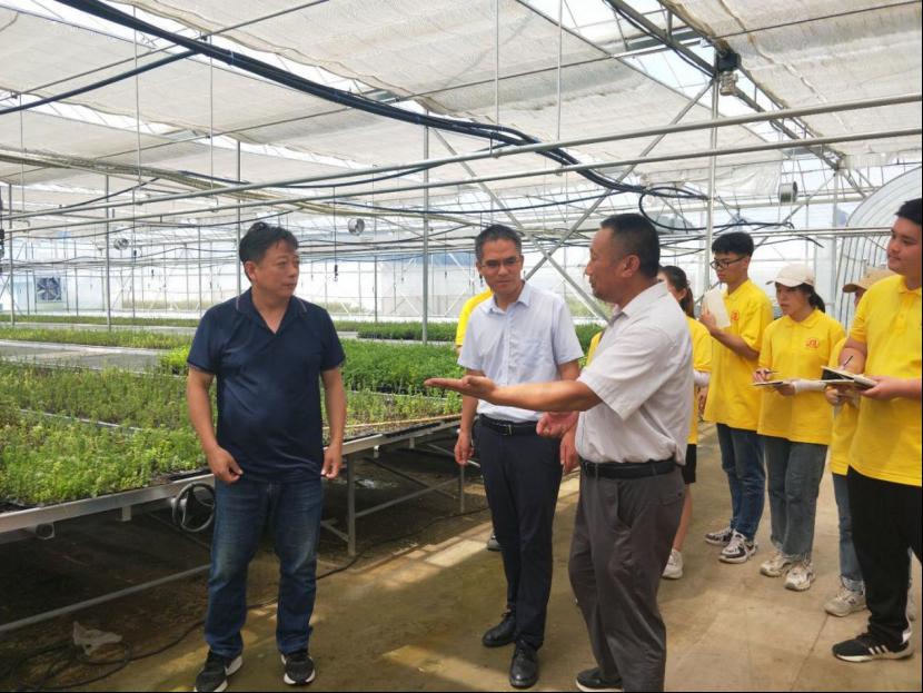 图为“丙玉蔬菜”基地负责人为实践队领导和学生讲解大棚育苗的相关知识。中国青年网通讯员 谷雪鹏 摄