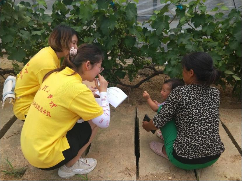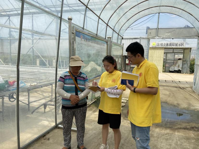 图为实践队员向蔬菜基地从业人员询问其对特色产业的了解。中国青年网通讯员魏瑞娜摄